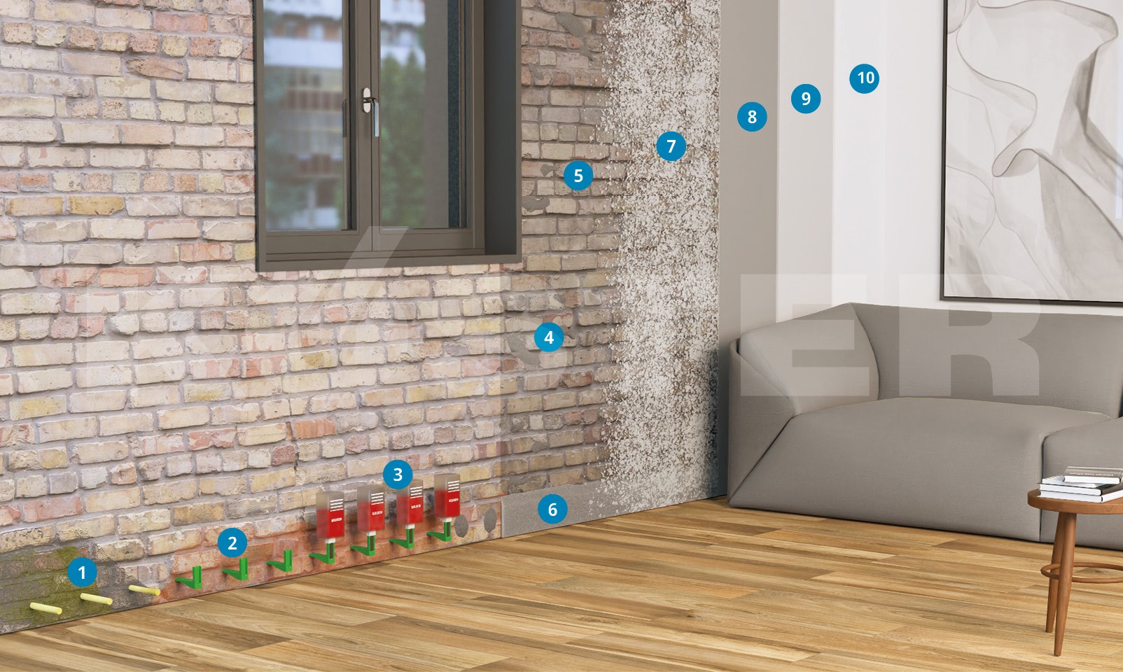 Tapauksissa, joissa vaurion aiheuttaja on kapillaarisesti nouseva kosteus, vanha rappaus on poistettava seinästä. Horisontaalisen vedeneristyksen asennuksen jälkeen on levitettävä KÖSTER Rappauslaasti. KÖSTER Rappauslaasti antaa seinämuurauksen kuivua vaurioitta. KÖSTER Rappauslaastit ovat avoimia vesihöyryn diffuusiolle sekä vettä hylkiviä. Seinään jäävän suolan KÖSTER Rappauslaasti imee niin, ettei suolaa erity pintaan eikä se aiheuta vauriota laastiin tai maaliin.