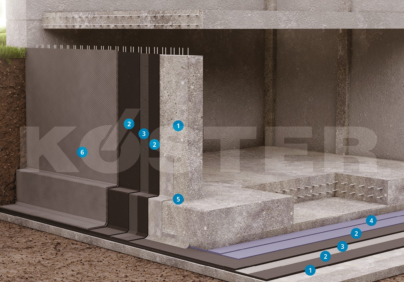 Pääasiallinen KÖSTER Deuxan 2C:lla tehtävä alueellinen vedeneristäminen suoritetaan kaksi kertaa ja KÖSTER Lasikuitu verkko upotetaan ensimmäiseen märkään kerrokseen. Yleisesti KÖSTER Lasikuitu verkkoa suositellaan upotettavaksi kerrosten väliin, koska kerrospaksuus on helpommin kontrolloitavissa ja se vaimentaa rakennuksen liikkeestä aiheutuvaa painetta.