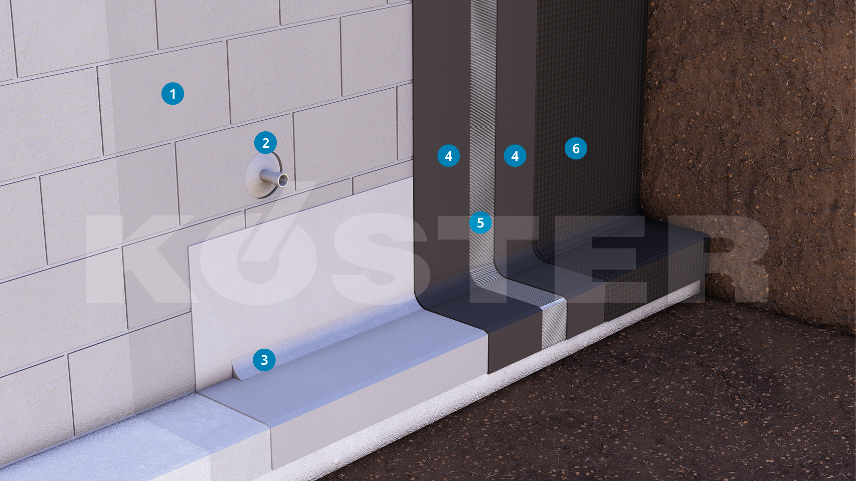 Aluksi levitetään KÖSTER NB 1 Harmaa sekoitettuna KÖSTER NB 1 Flexin kanssa suojaamaan alempien vedeneristys liitännöiden taakse valuvalta vedeltä. Vedeneristyksen kuormittumisen ehkäisemiseksi asennetaan pyöristetyt viisteet seinän ja lattian yhtymäkohtaan.