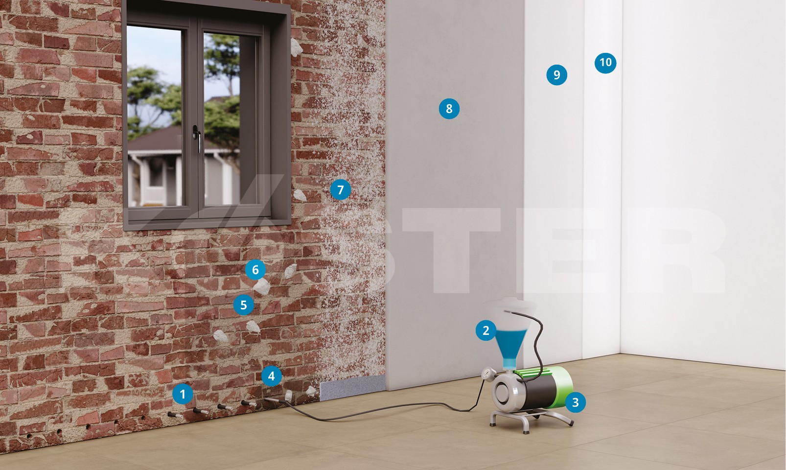 Tapauksissa, joissa kapillaarisesti nouseva kosteus on aiheuttanut vaurioita, vanha laasti on poistettava seinästä. Kapillaarikatkon asennuksen jälkeen vaaditaan KÖSTER Rappauslaastin käyttöä.