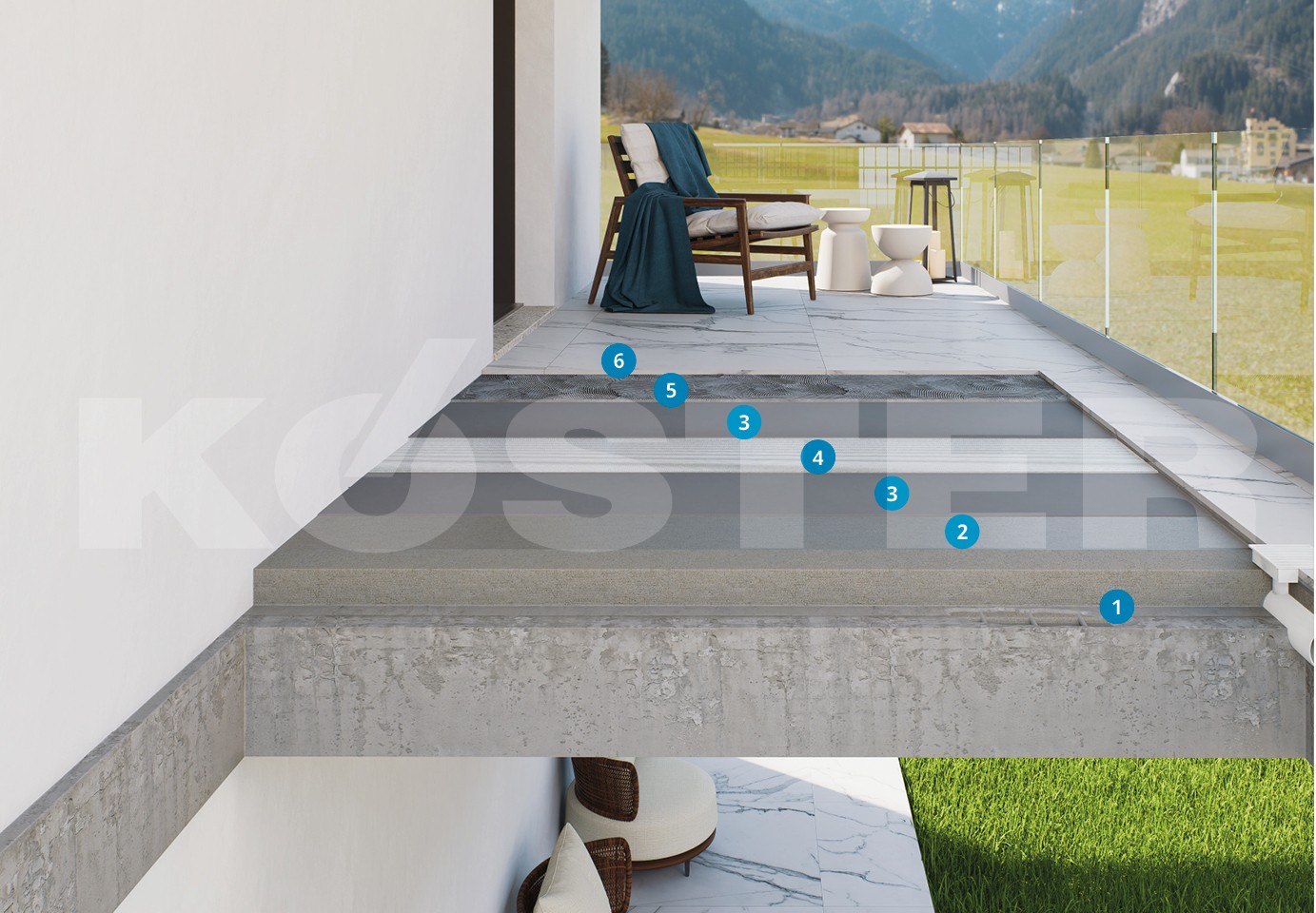 Parvekkeiden ja terassien mineraalinen vedeneristys tehdään halkeamat silloittavalla KÖSTER NB Elastic valkoisella tai harmaalla. Tämä vesieriste kestää jalankulkua ja se voidaan peittää laatoilla. Se kiinnittyy myös kosteisiin alustoihin.